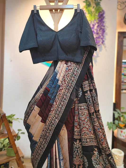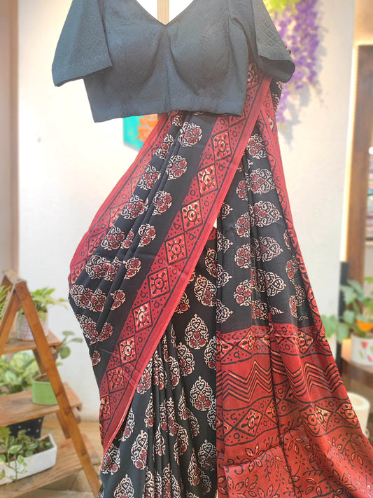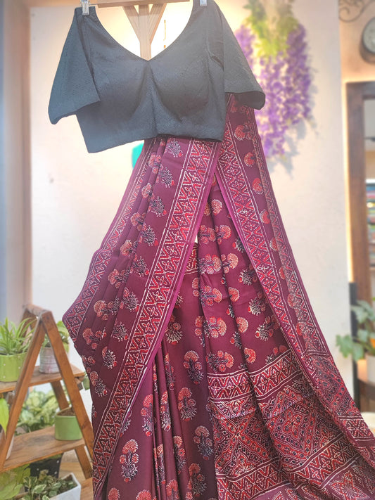 Black & Maroon Ajrakh Print Modal Saree | Soft Modal Fabric | Traditional Block-Style Design