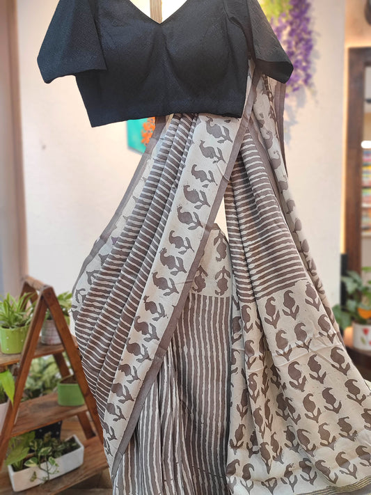 Grey Modal Silk Saree with Elephant Print & Golden Pallu | Soft Modal Fabric Saree