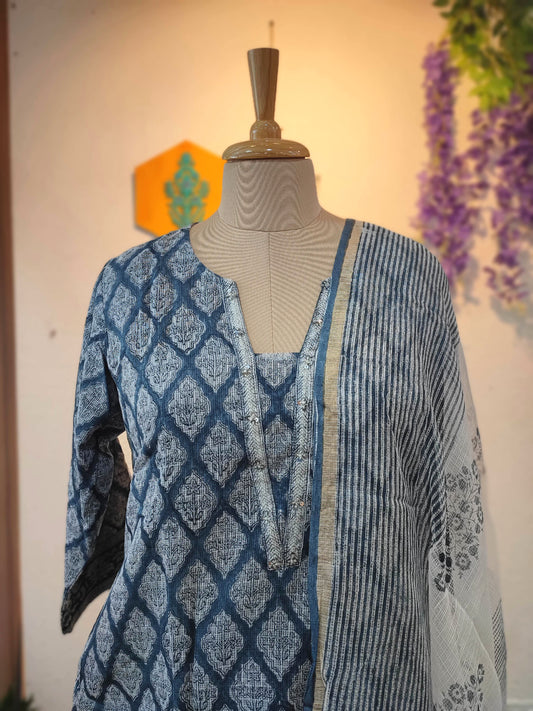 Handloom Cotton Kalamkari Block Print Navy Band Collar Kurta for Women