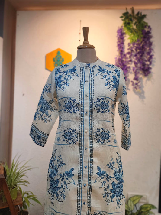 Off White & Blue Floral Printed Linen Cotton Kurta Pant Set for Women | Premium Ethnic Office Wear