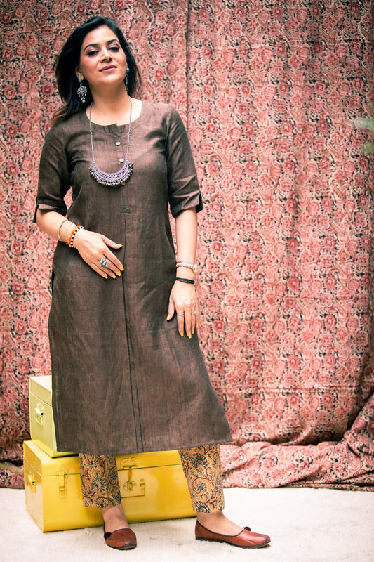 Chocolate Brown Premium Pure Linen Loose Fit Kurta with Kalamkari Pants Combo
