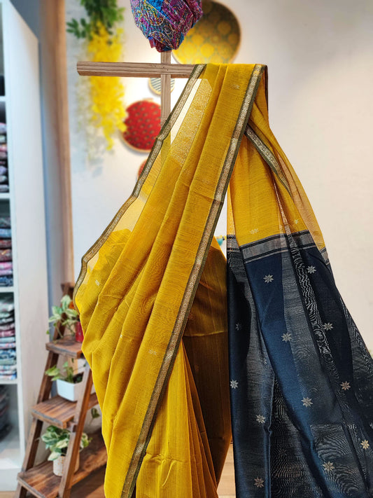 Yellow & Black Maheshwari Silk Saree with Thin Zari Border