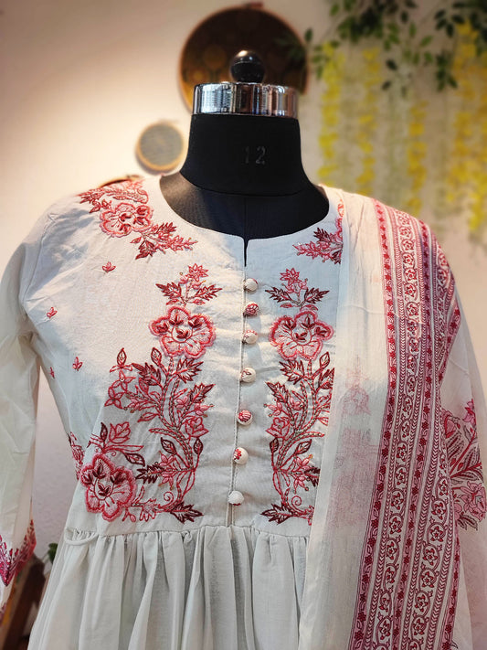 White Cotton Flared Suit With Embroidery & Mulmul Dupatta