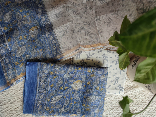 Blue Floral Printed Kota Suit Set with Off-White Leaf Print Dupatta