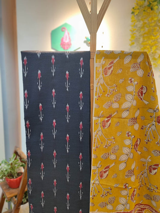 Black Ikkat Suit with Yellow Kalamkari Cotton Pant and Multicolor Dupatta