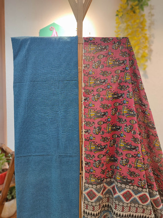 Blue Ikkat Suit with Pink Kalamkari Cotton Pant and Multicolor Dupatta