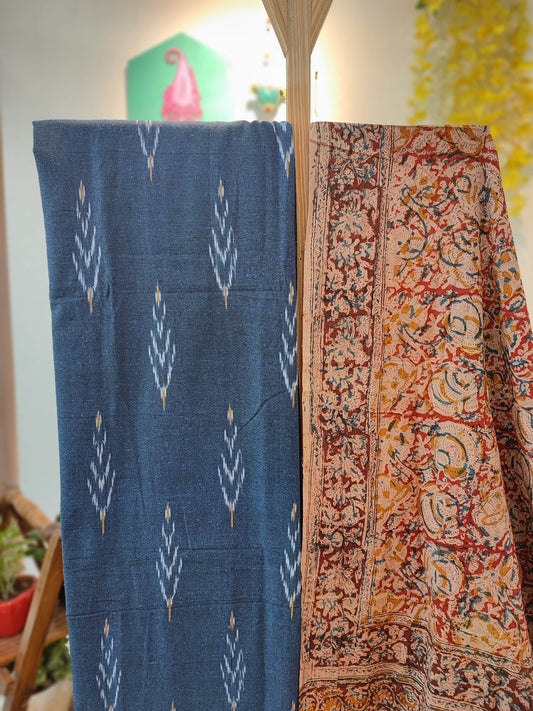Blue Classic Ikkat Suit Set with Kalamkari Prints, Bottom, and Dupatta