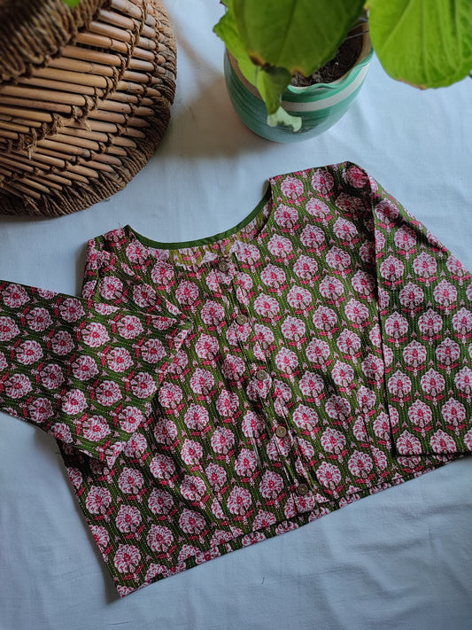 Moss Green & Pink Pure Cotton Handblock Printed Contemporary Blouse/ Crop Top