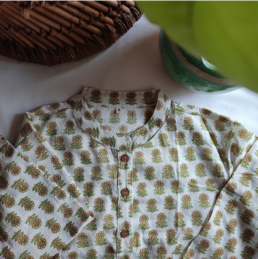 Off White & Pink Green Pure Cotton Handblock Printed Contemporary Blouse/ Crop Top