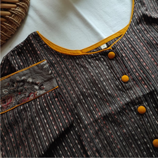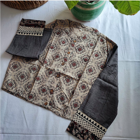 Slate Grey & Beige Pure Cotton Kalamkari Handblock Printed Contemporary Blouse/Crop Top