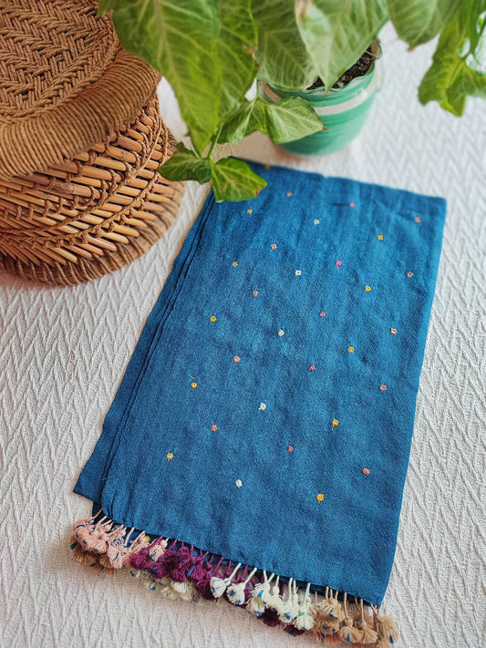 Dark Denim Blue Pure Wool Woven Handloom Stole With Mirror Work