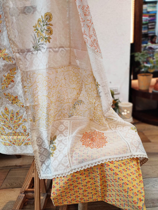 White Handblock Print Pure Chanderi silk Suit with jamdani Golden Dupatta