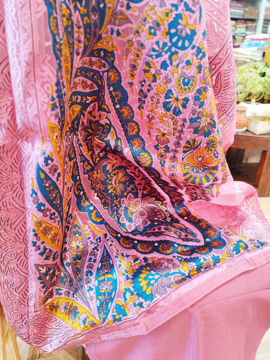 Pink Soft Chanderi Silk Kurta with , Fancy Satin Organza Dupatta , and Cotton Bottom
