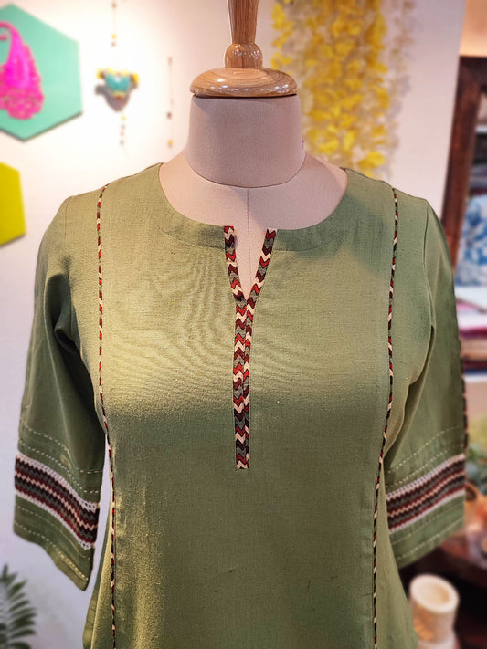 Green Handloom Cotton Kurta with Multicolor Pant Set