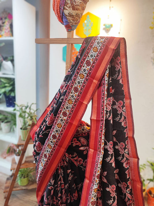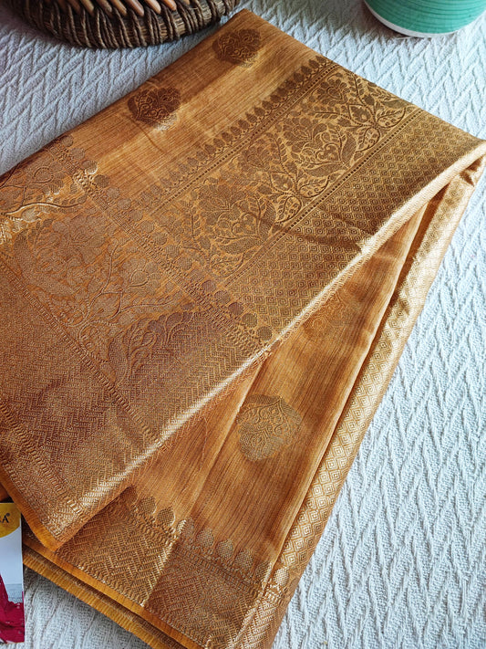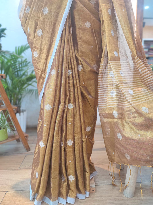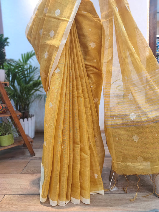 Mustard Gold Mulmul Tissue Saree with White Floral and Running Blouse