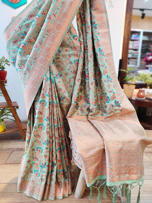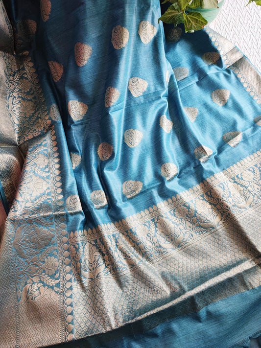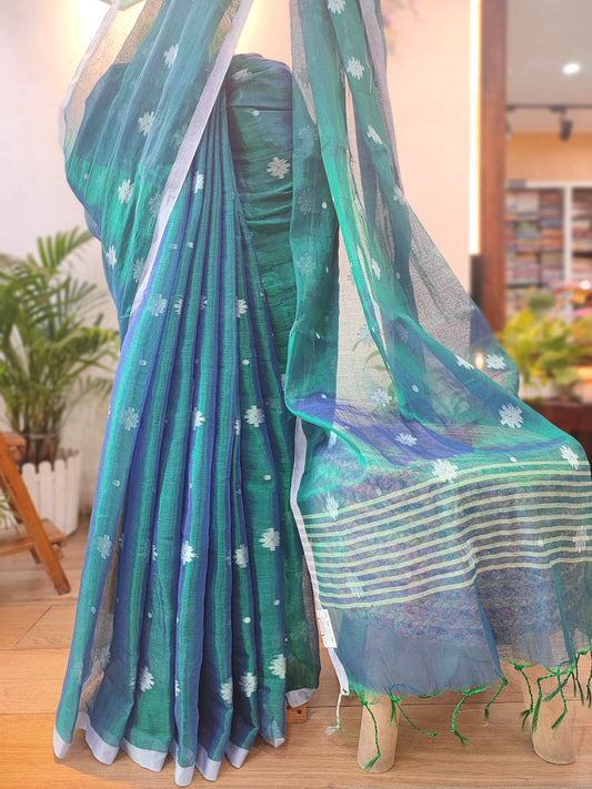 Elegant Teal Green & Royal Blue Mulmul Tissue Saree with White Motifs