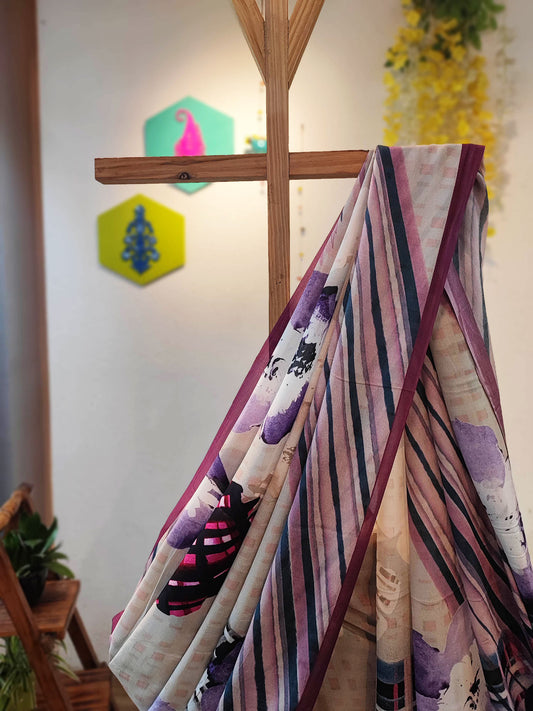 Purple Geometric & Floral Print Pure Crepe Saree with Running Blouse