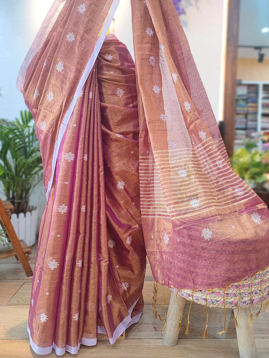 Elegant Copper-Brown & Mauve Mulmul Tissue Saree with White Motifs