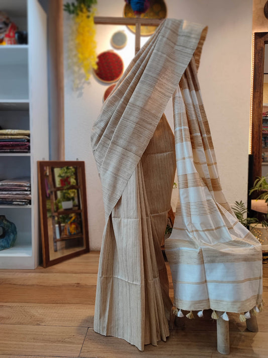 Natural Brown Tussar Gheecha Silk Saree with Stripes