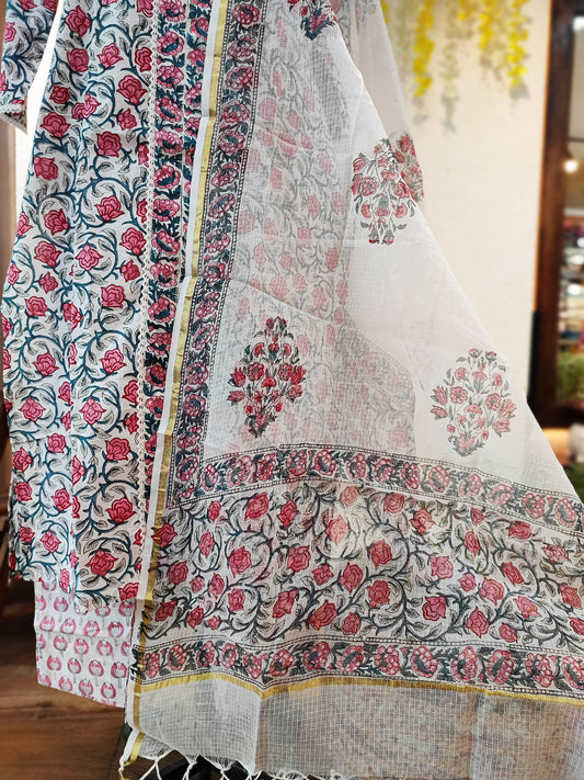 Pink Floral Cotton Suit Set With Kota Dupatta