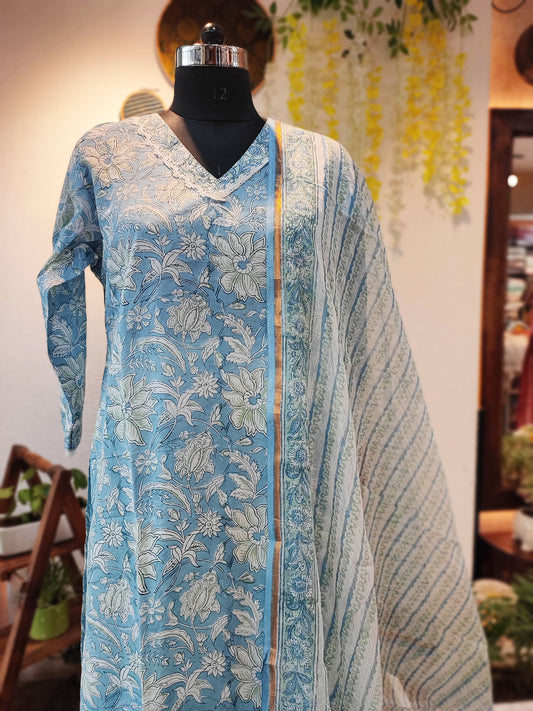 Sky Blue Cotton Suit Set With Kota Dupatta