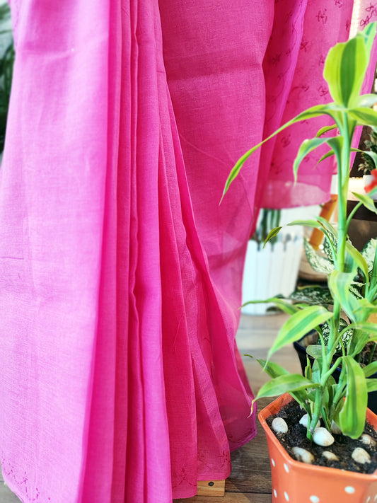 Magenta Pink Cotton Voile Saree With Lucknowi Handwork With Contrast Blouse