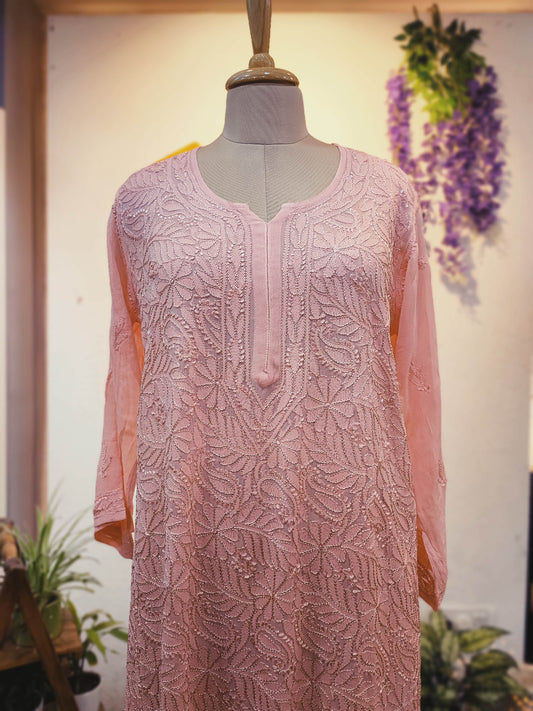 Blush Pink jorjet Silk by Cotton Lucknowi Embroidered Kurta – Elegant Straight Fit