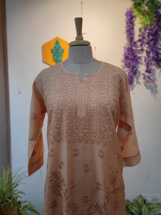 Warm Peach Chanderi Silk by Cotton Lucknowi Embroidered Kurta – Elegant Daily Luxe