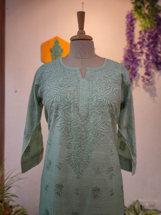 Sage Green Chanderi Silk by Cotton Lucknowi Embroidered Kurta – Straight Fit