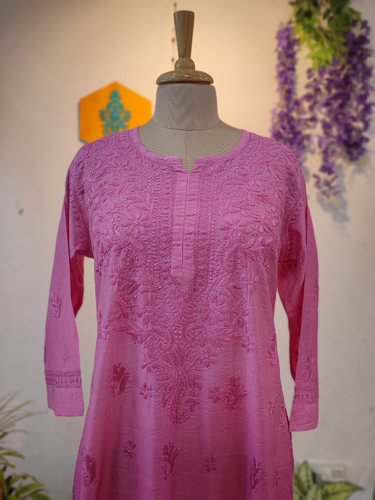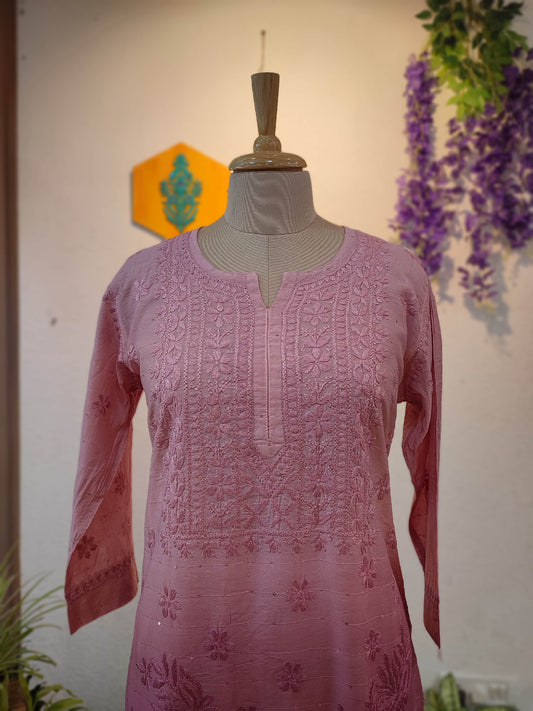 Rose Pink Chanderi Silk by Cotton Lucknowi Embroidered Kurta – Straight Fit