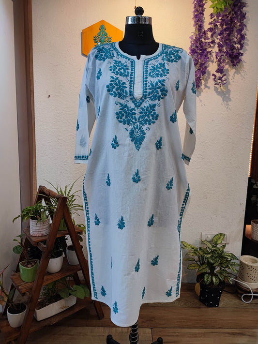 White Cotton Lucknowi Chikankari Kurta with Teal Blue Embroidery for Women