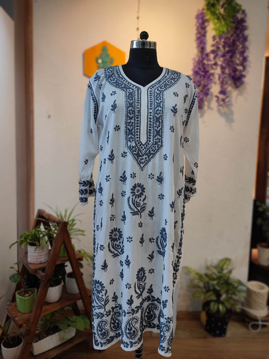 White Cotton Lucknowi Chikankari Kurta with Grey Thread Embroidery for Women