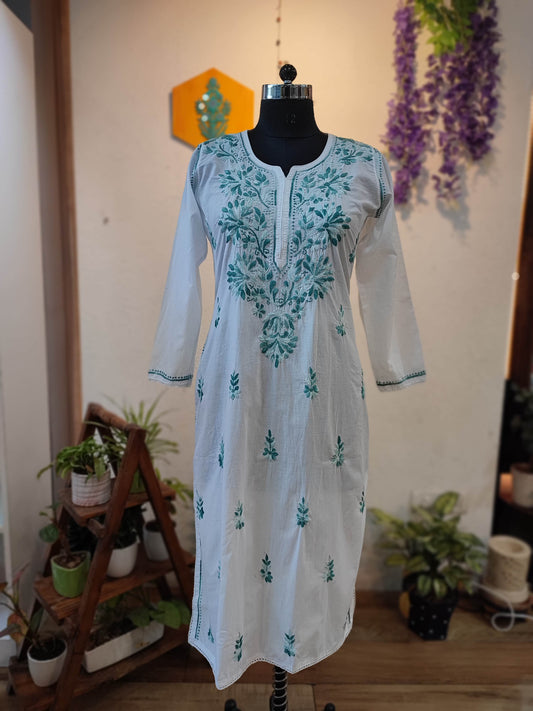 White Cotton Lucknowi Chikankari Kurta with Green Thread Embroidery for Women