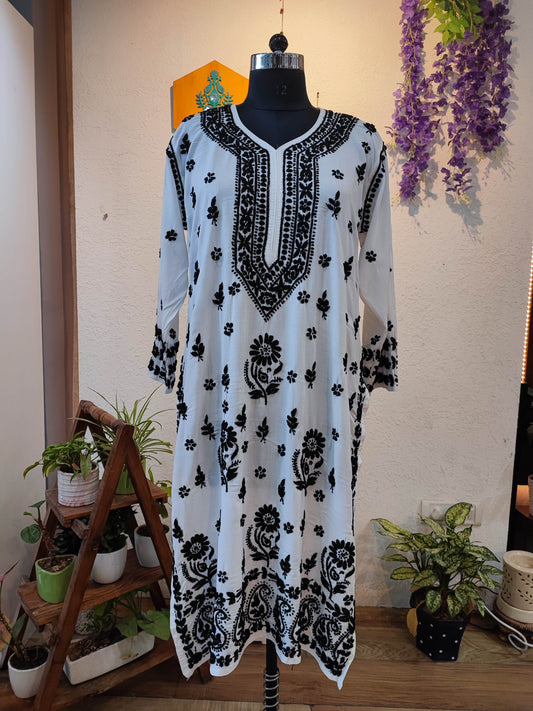 White Cotton Lucknowi Chikankari Kurta with Black Thread Embroidery for Women