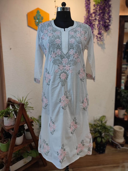 Pastel Grey Cotton Lucknowi Chikankari Kurta with Pink Floral Embroidery for Women