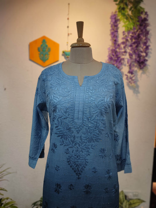 Dual Tone Blue Chanderi Silk by Cotton Lucknowi Embroidered Kurta – Modern Elegant Look