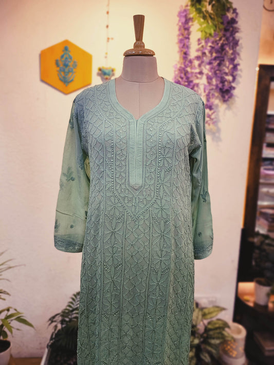 Premium Mint Green Full-Length Lucknowi Chikankari Kurta for Women