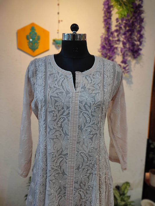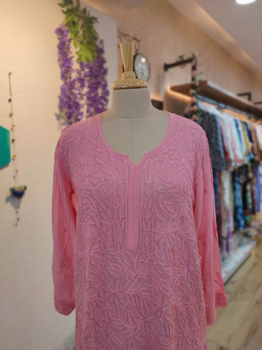 Soft Blush Pink jorjet Silk by Cotton Lucknowi Embroidered Kurta – Elegant Statement Piece
