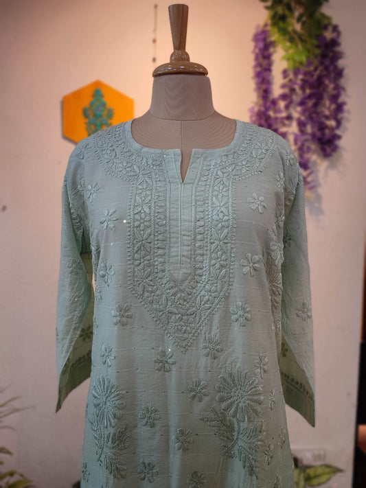 Mint Green Chanderi Silk by Cotton Lucknowi Embroidered Kurta – Straight Fit