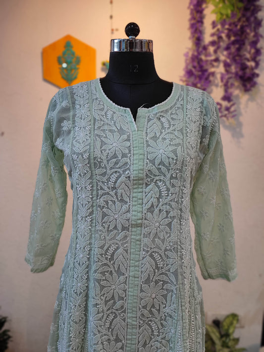 Mint Green jorjet Lucknowi Kurta with Full Embroidery – Elegant Ethnic Wear