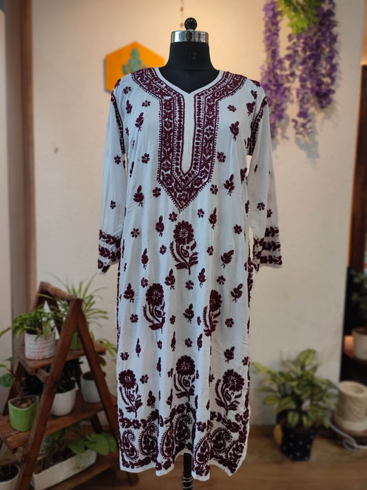 White Cotton Lucknowi Chikankari Kurta with Maroon Thread Embroidery for Women