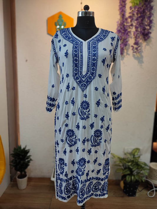 White Cotton Lucknowi Chikankari Kurta with Blue Thread Embroidery for Women