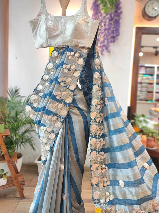 Stunning Blue & Grey Striped Shimmer Georgette Partywear Saree