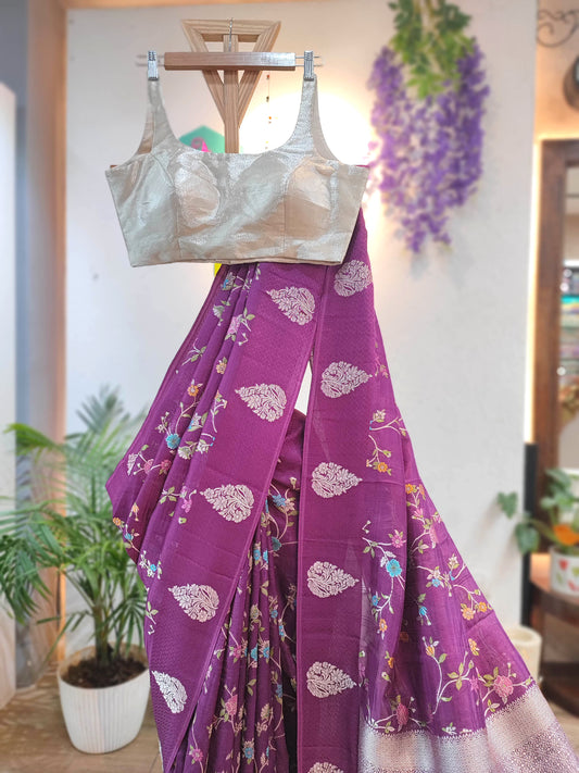 Purple Crepe Silk Saree with Meenakari Banarasi Weave on Pallu & Border