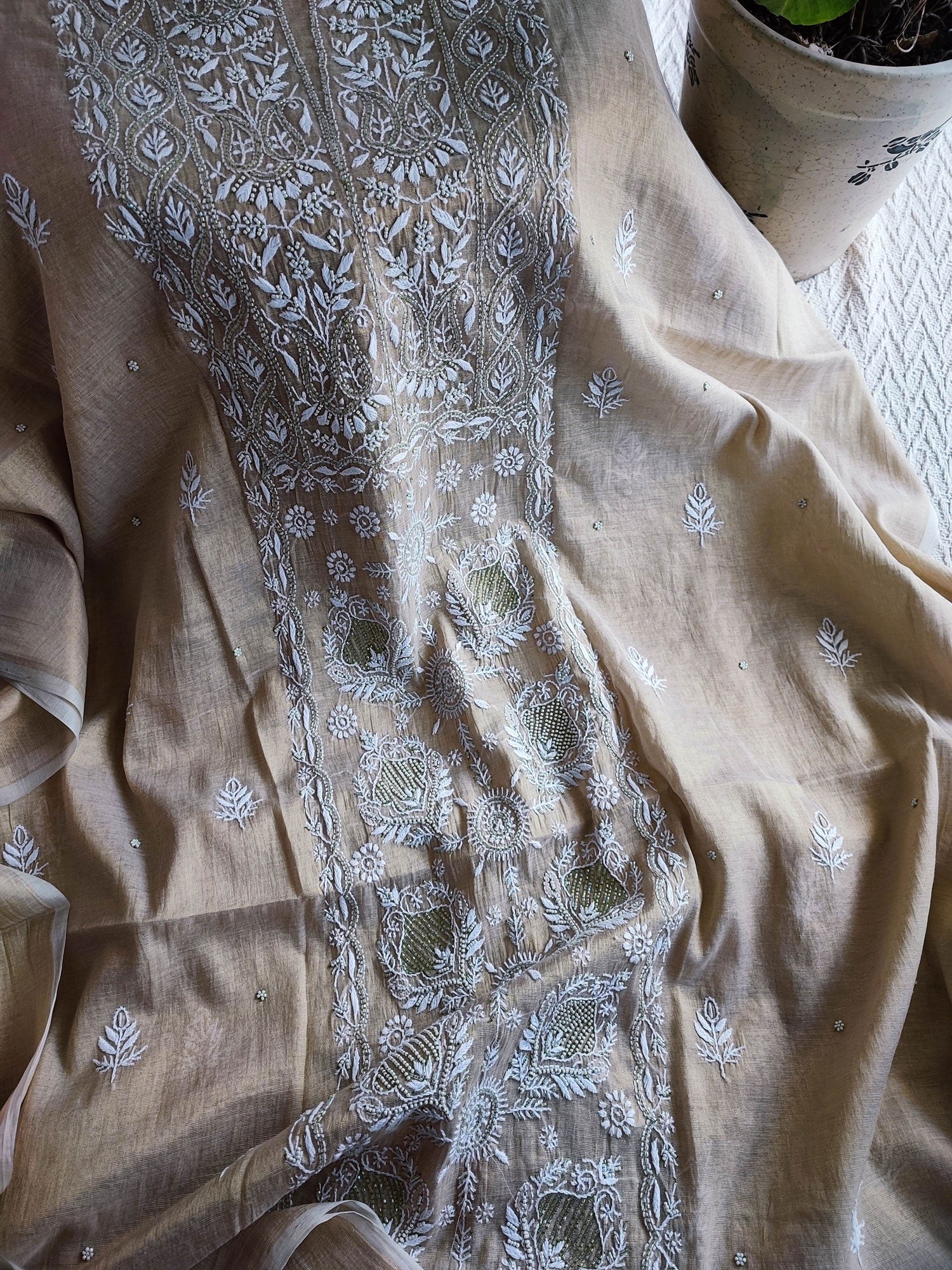 Beige Mul Tissue Kurta Fabric & Dupatta with Pearl Lucknowi Embroidery