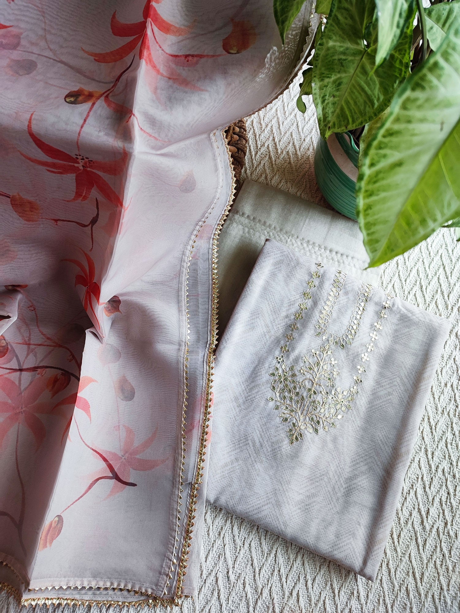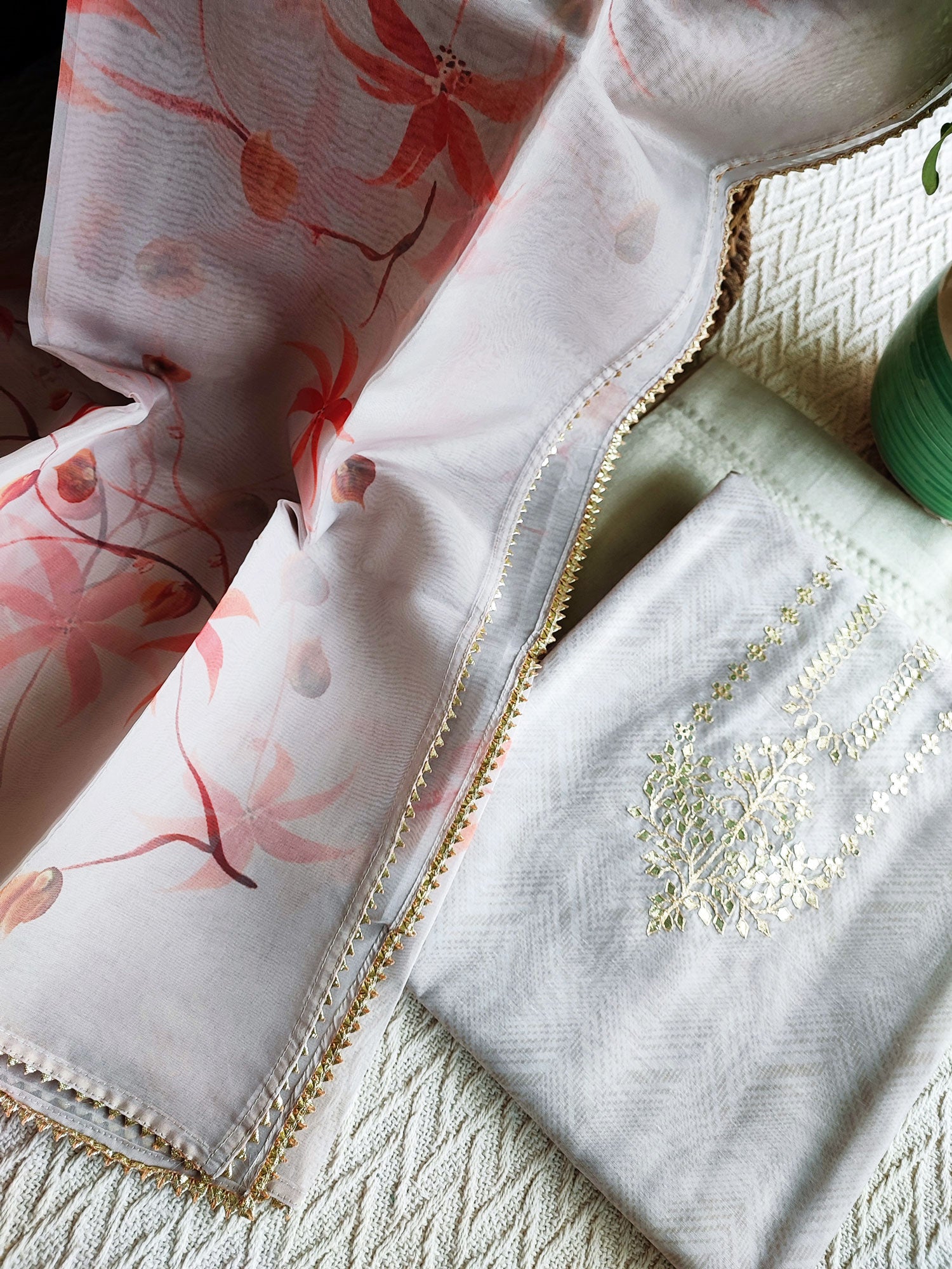 Chanderi Silk Suit with Gota Neck and Organza Hand Painted Dupatta
