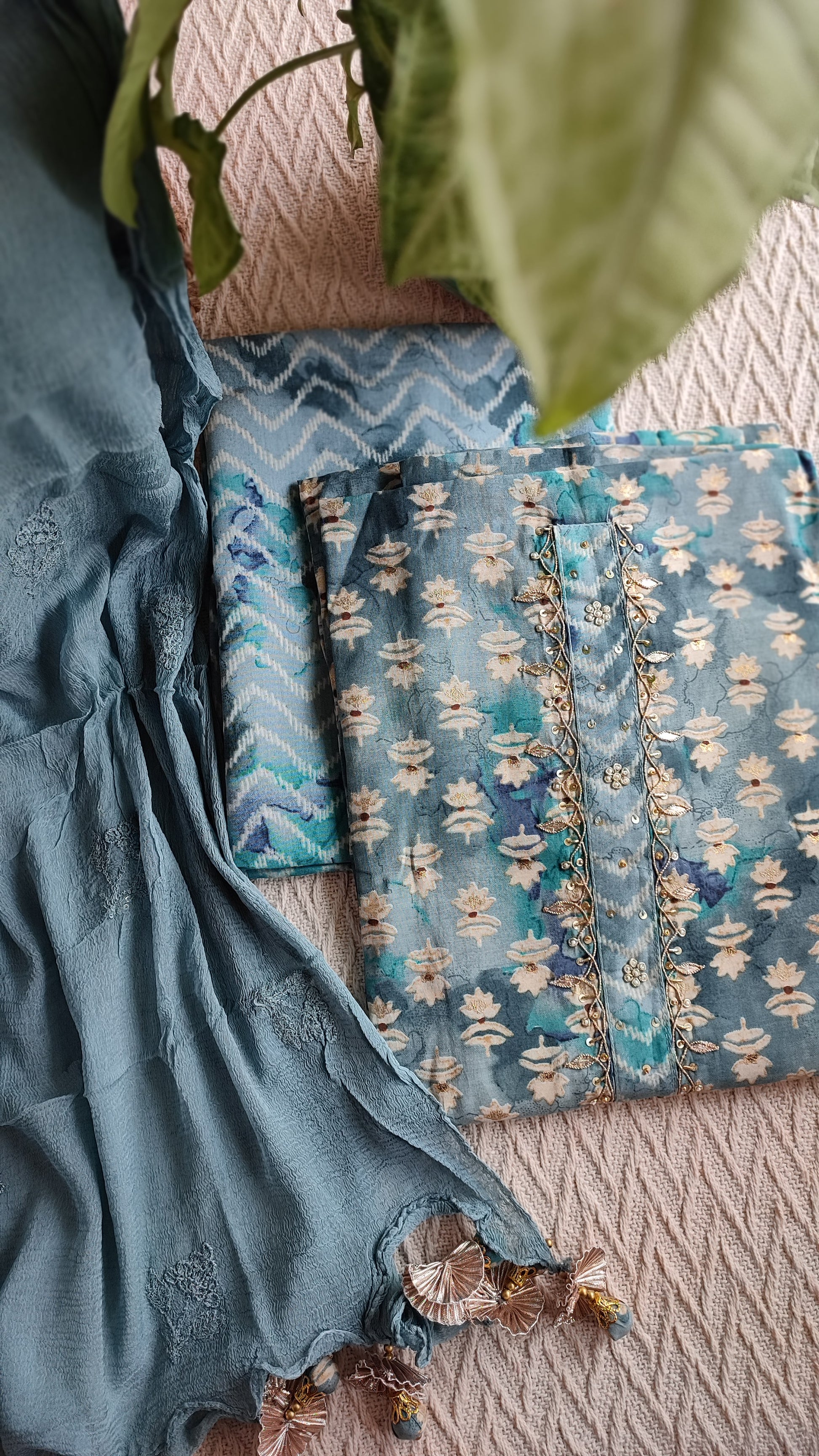 Denim Blue & Teal Modal cotton Handblock Printed & Embroided Suit Set with Chiffon Dupatta