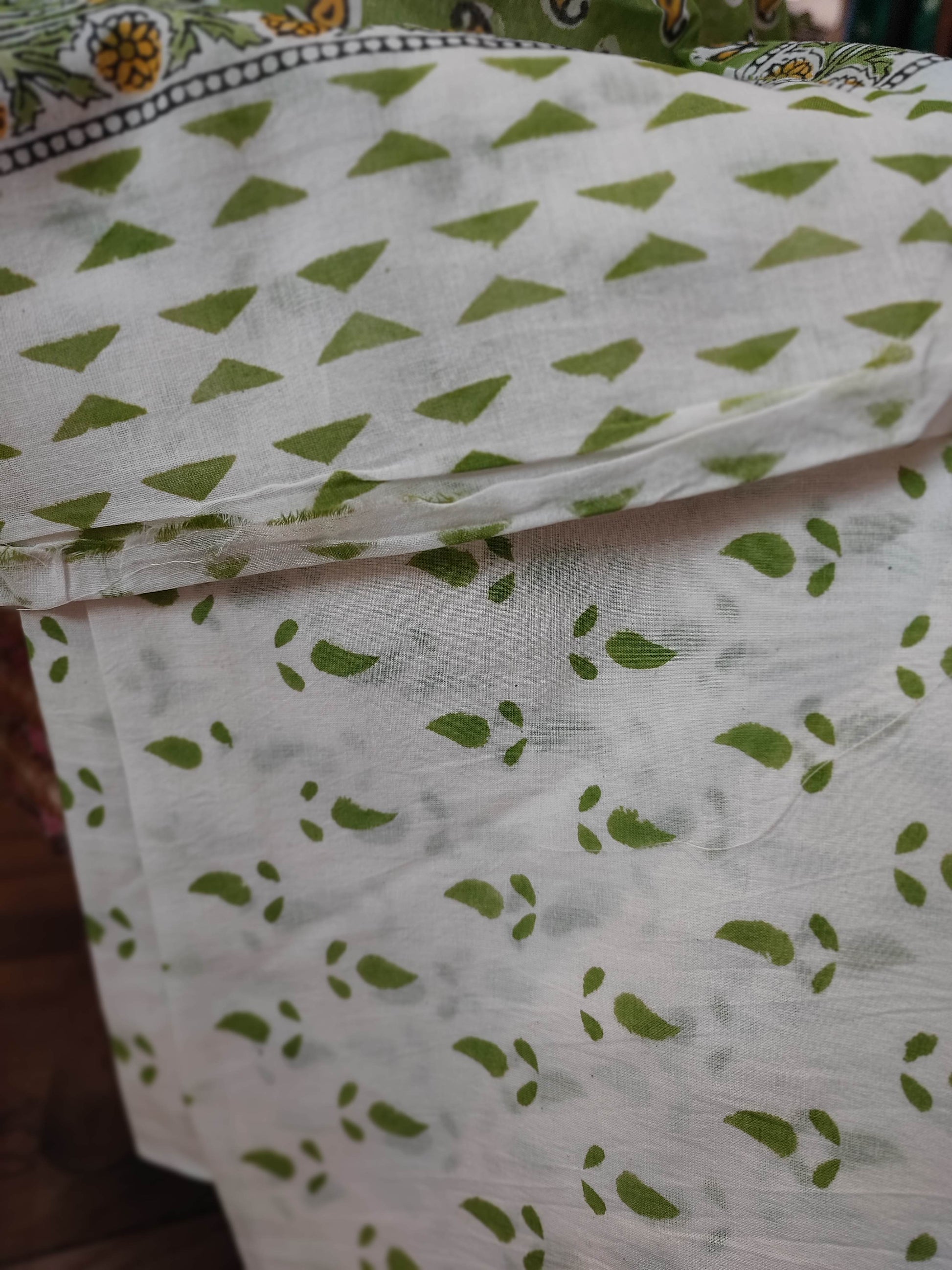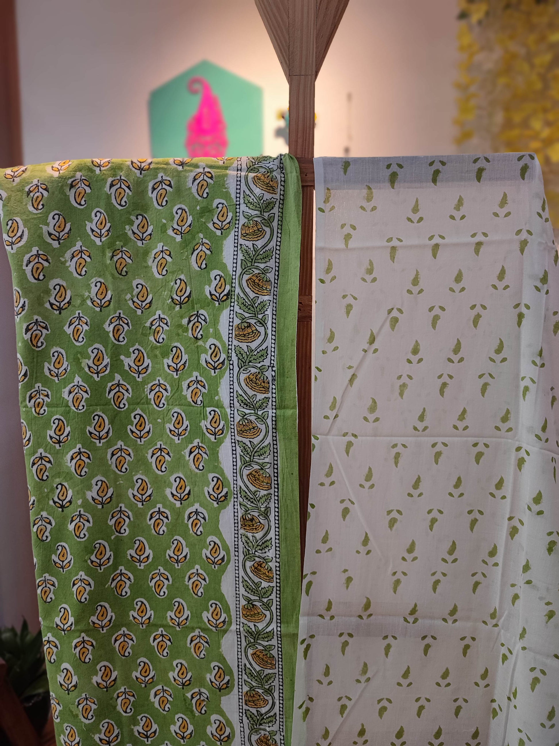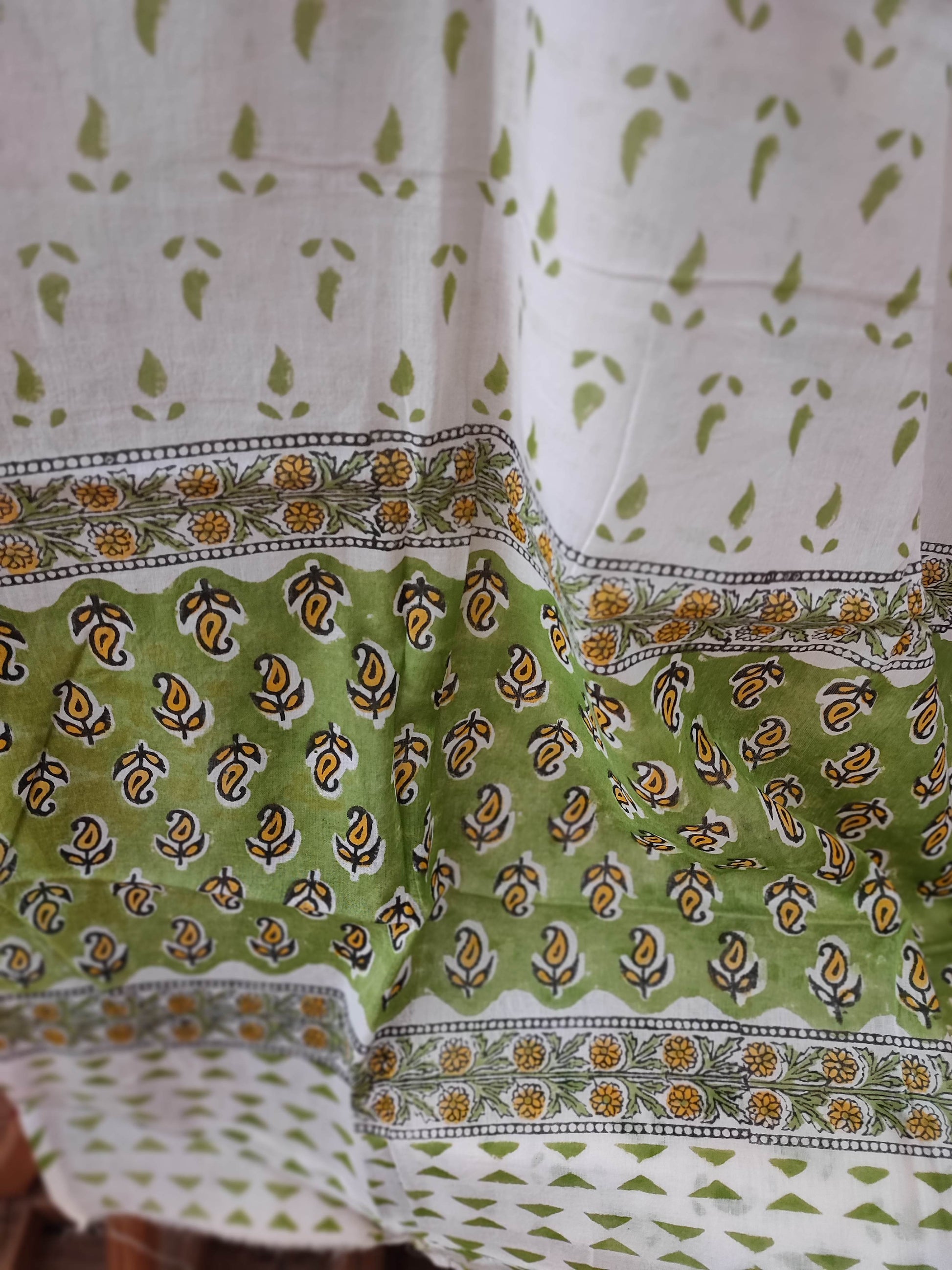 Green and White floral Pattern Handblock Printed Cotton Suit Material with Cotton Bottom and Dupatta