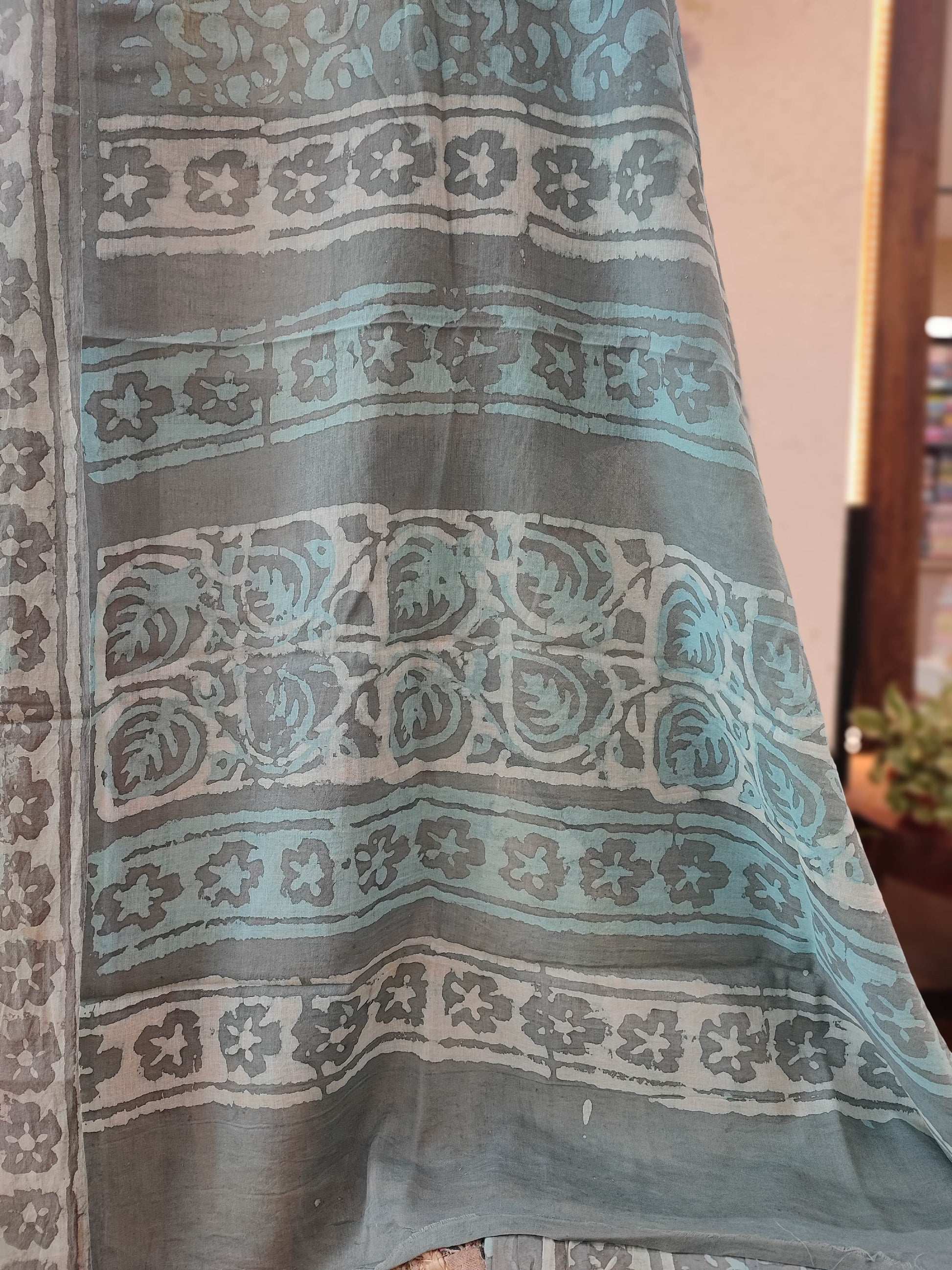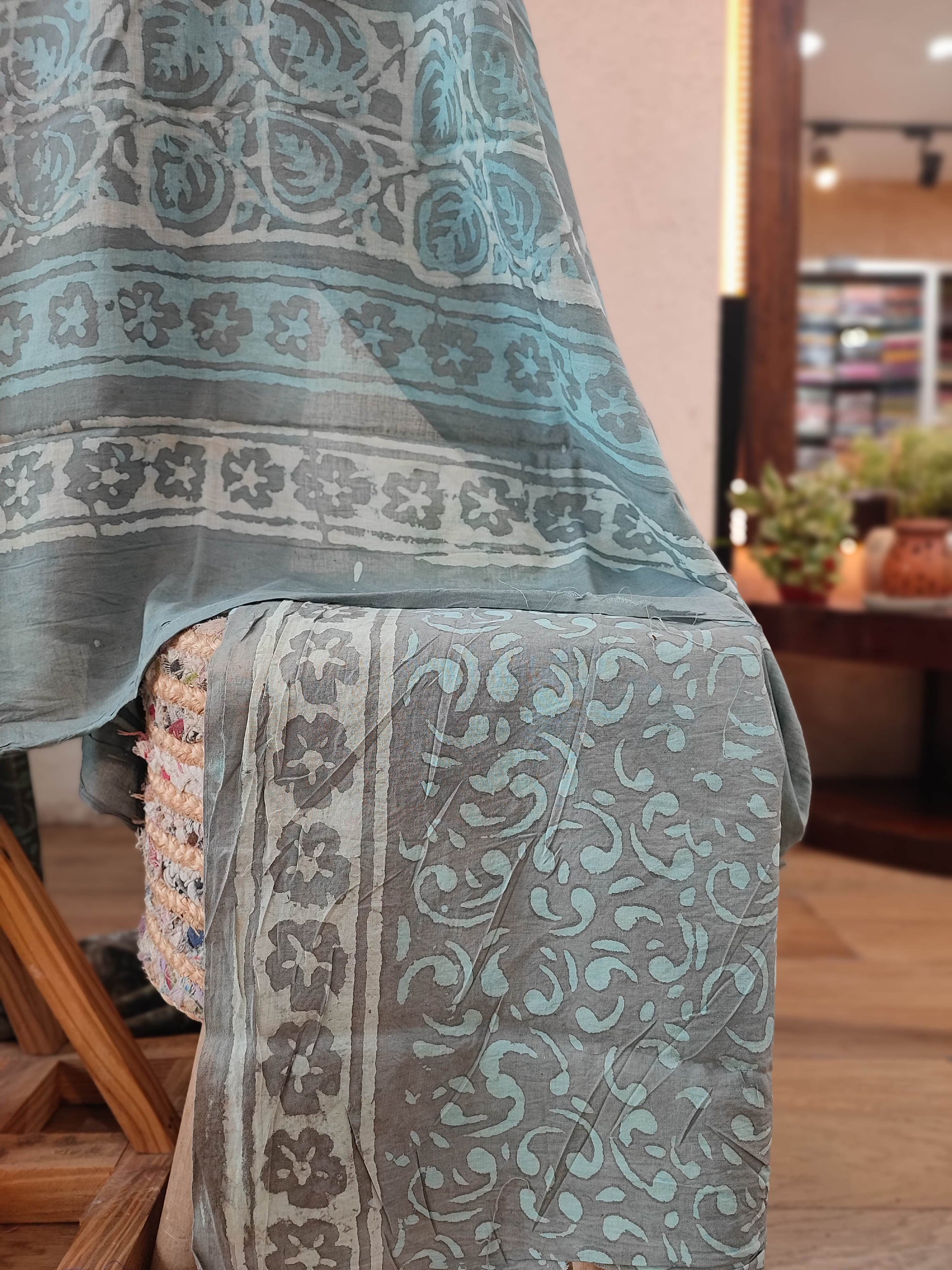 Light Blue Beige and White Floral Cotton Suit with Cotton Bottom & Mulmul Cotton Dupatta