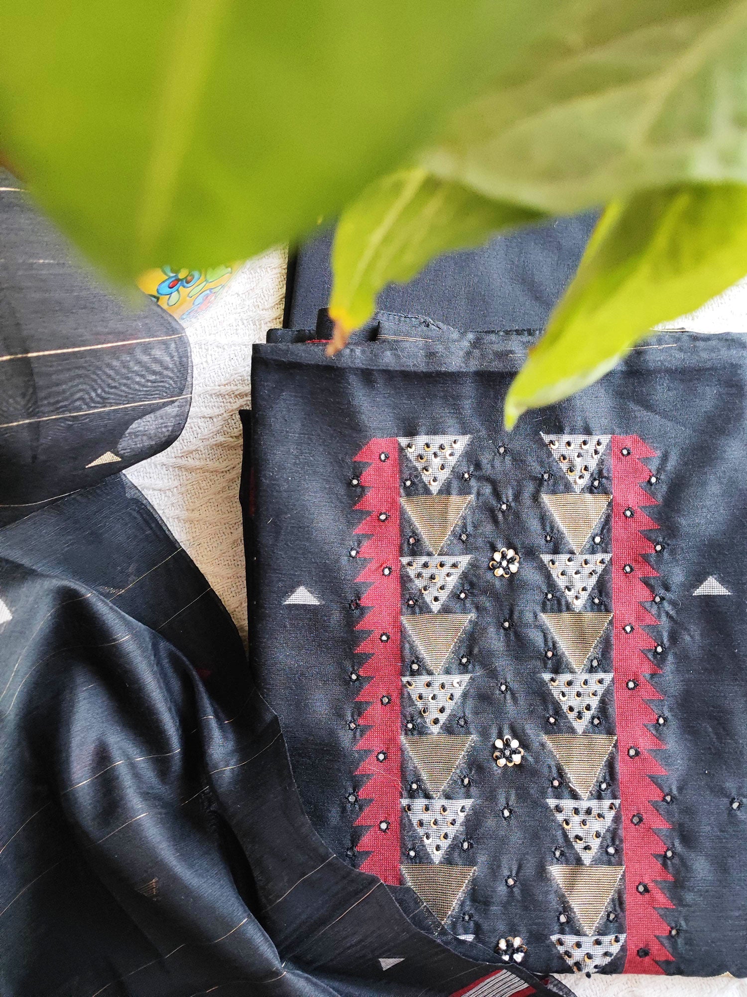 - Weaving: Handwoven Resham Jamdani with intricate geometric patterns